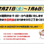 12/21(土)~1/6(月)は9:00~20:00まで営業いたします!! また、期間中は休日料金でのご案内と…